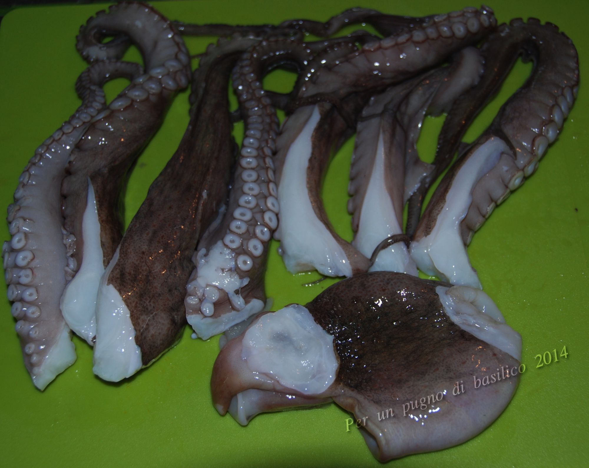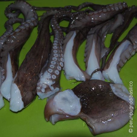Scongelate il polpo, sciacquatelo e tagliatelo a pezzi