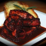 In un tegame mettete a soffriggere la cipolla e alcune foglie di salvia e, quando la cipolla e’ appassita, unite il polpo alzate la fiamma e rosolare fino a che il polpo non cambia colore,