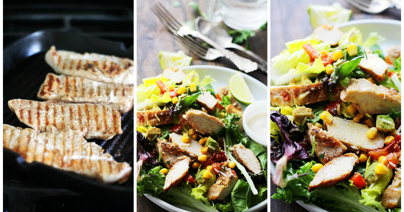 Disponete l’insalata nel piatto, conditela con la salsa poi completate con il pollo.