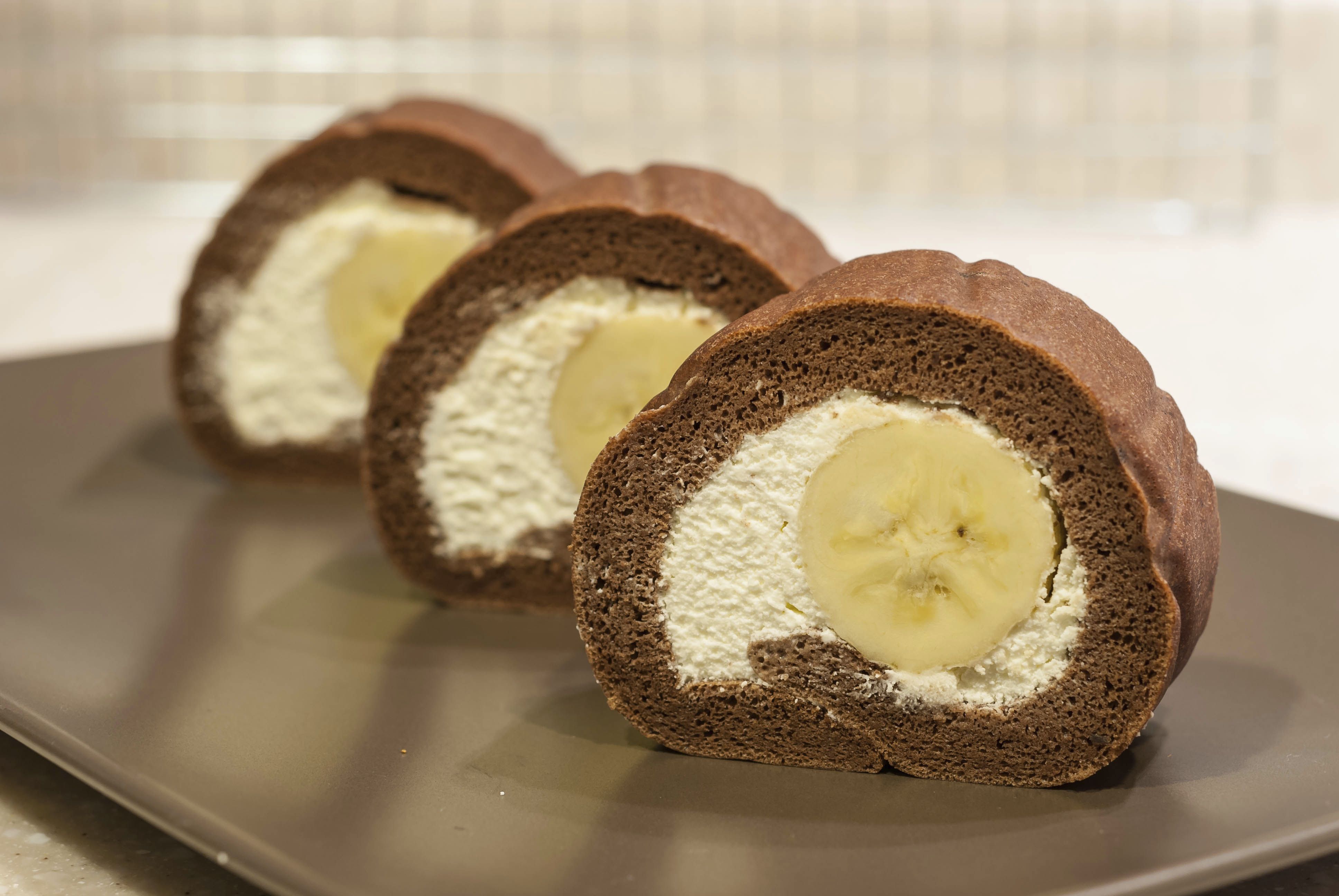 Il Rotolo al cacao, crema di mascarpone e banana è preparato con una pasta biscotto al cacao. Una vera delizia per gli amanti dell’abbinamento cioccolato-banana.