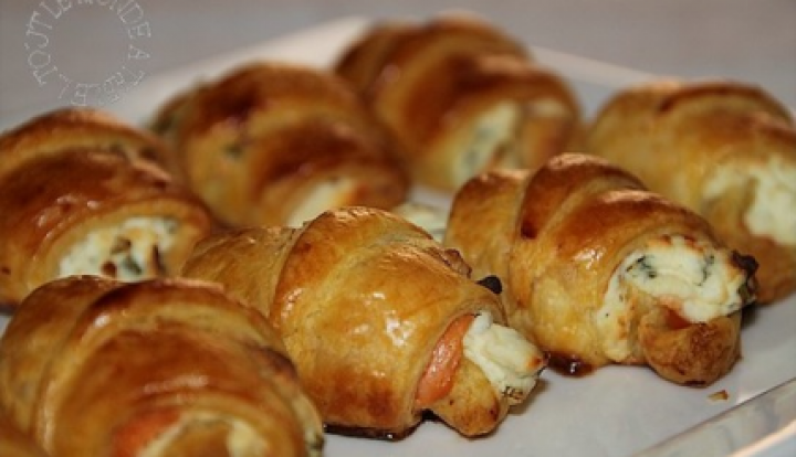 Piccoli croissant di pasta sfoglia ripiena di formaggio fresco con erba cipollina e salmone affumicato. Ideali per un antipasto o un aperitivo goloso !