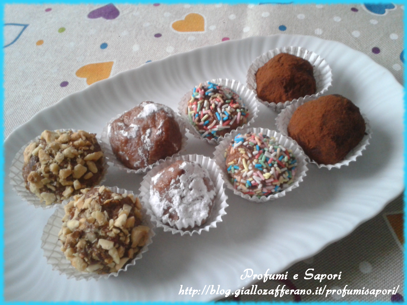Trascorso questo tempo, formare con le mani delle palline di impasto (io ho usato come dose un cucchiaino) e passarle nel cacao amaro, nello zucchero a velo o nelle nocciole tritate, a seconda dei vostri gusti.
