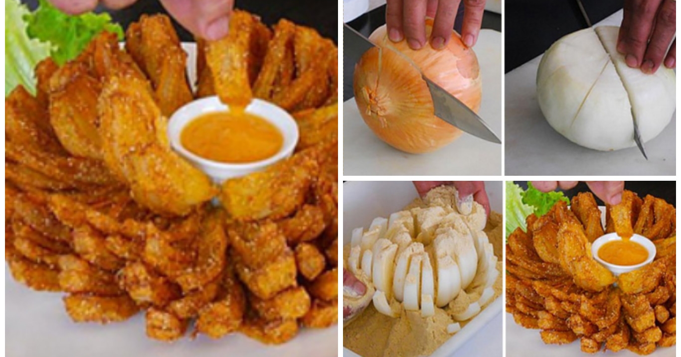 Fiori di cipolla croccanti con salsa dolce o speziata