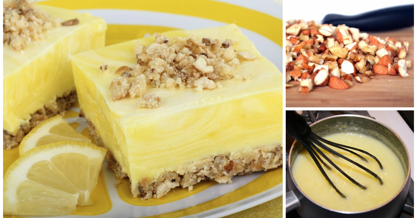 Deliziosi quadrotti al limone e noci, una ricetta originale e squisita con crema al limone e una base di biscotti e noci. Cremoso e croccante, il dolce ideale per un dopo cena.