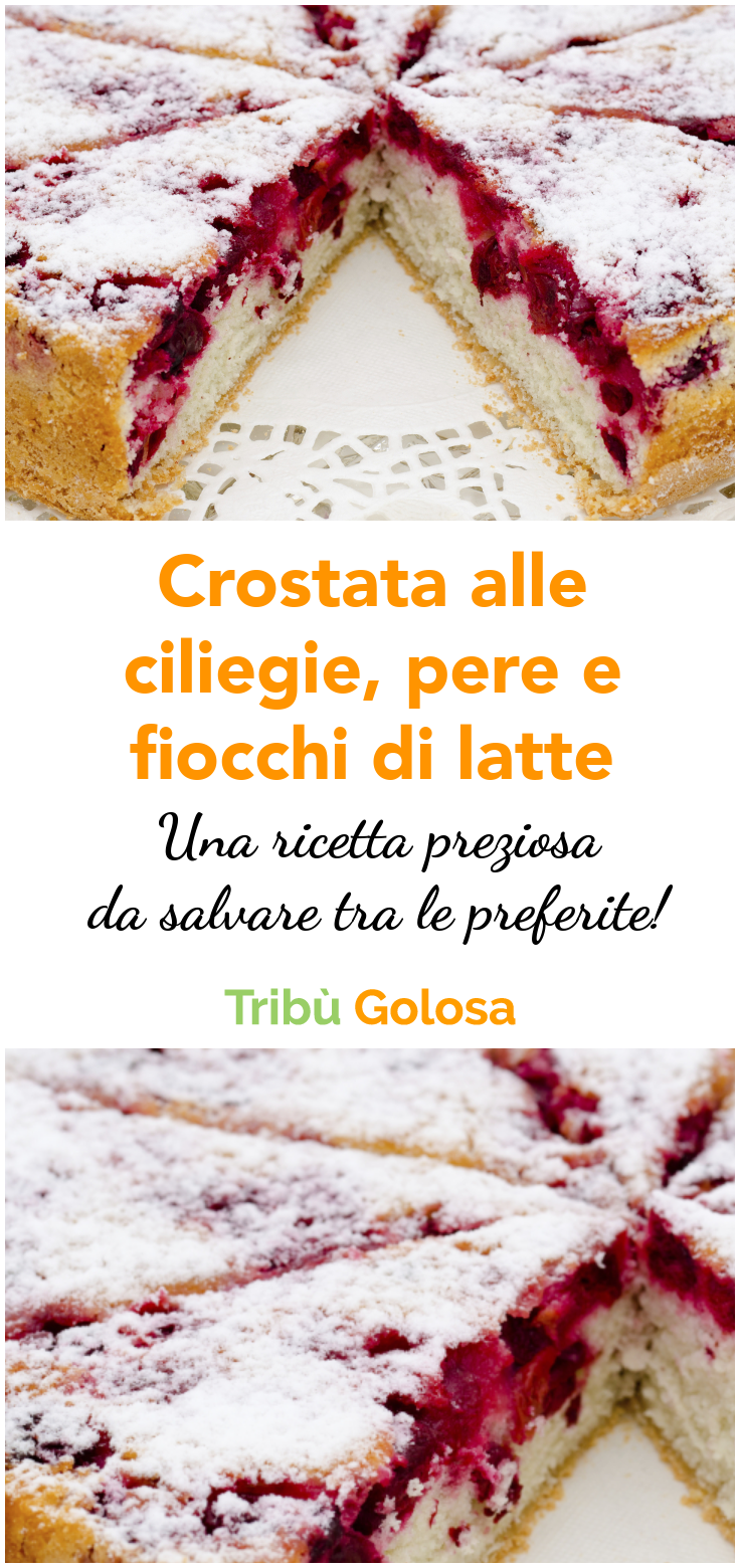 Crostata alle ciliegie, pere e fiocchi di latte, una torta morbida e prelibata, con tanta frutta e una base di pasta frolla che la rendono morbida e leggera.