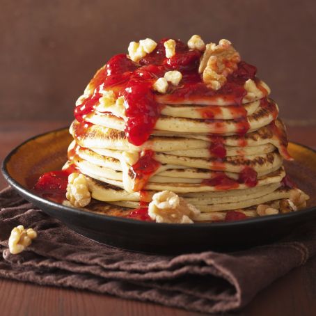 Ungere una padella, con un mestolo di piccole dimensioni versare nella padella piccole quantità di impasto e lasciar cuocere, girare quando fanno le bolle. Guarnire con un cucchiaio di marmellata di fragole e noci tritate grossolanamente.