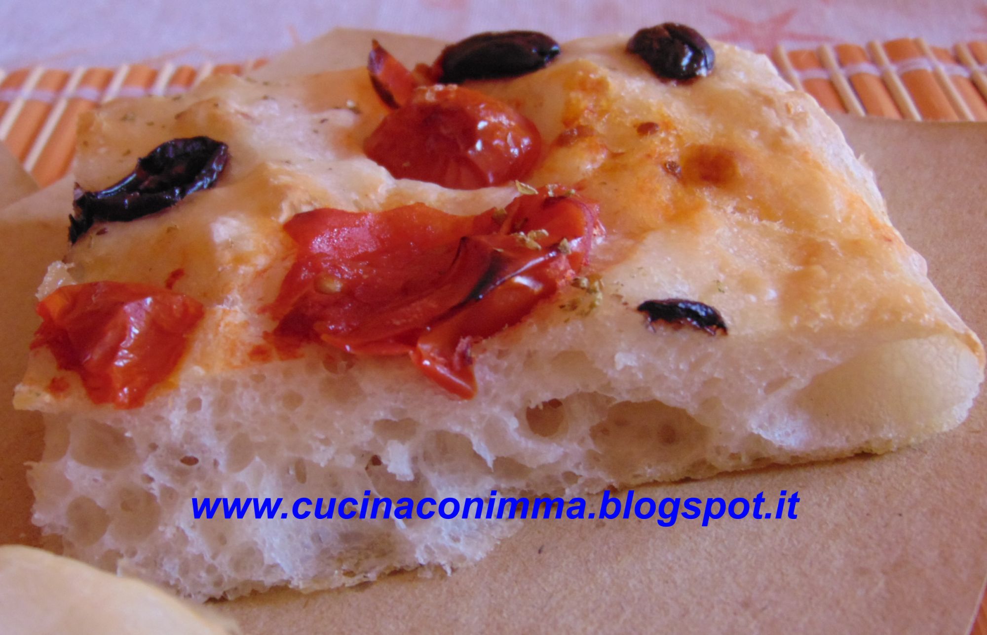 A questo punto io ho farcito la focaccia per metà nel modo classico ovvero sale grosso e rosmarino , l'altra metà l'ho condita con olive nere denocciolate, pomodorini ed origano.