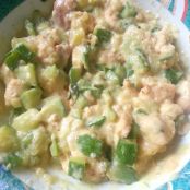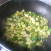 Tagliare la zucchina e la cipolla e con un filo d'olio lasciare rosolare per qualche minuto. Aggiungere uno spicchio d'aglio tagliato a metà e privato del germe centrale. Aggiustare di sale e pepe e far cuocere ancora per circa 5 minuti con un coperchio. Aggiungere il basilico.