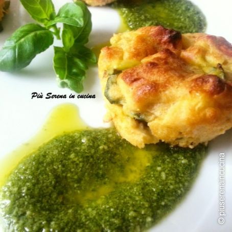 Distribuire il composto negli stampini da muffin e cuocere in forno preriscaldato a 200 gradi per circa 30 minuti. Servire accompagnando i tortini con un leggero pesto al basilico.