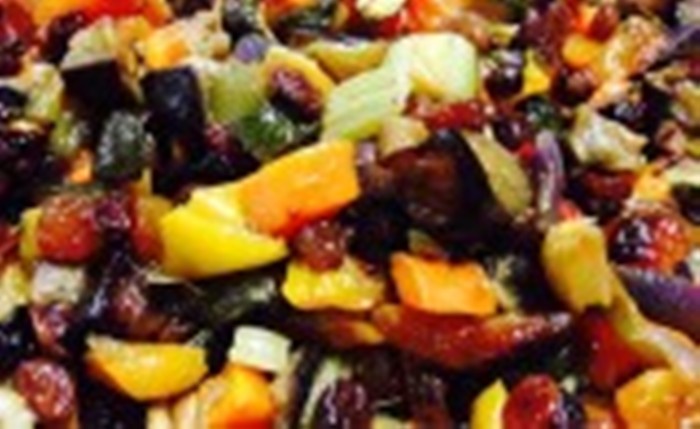Trasferisci in forno caldo a 180 gradi per 40 minuti: trascorso questo tempo, aggiungi lo zucchero di canna, l’aceto, l’uvetta e le albicocche sminuzzate. Fai cuocere per altri 10 minuti e lascia raffreddare il tutto prima di servire