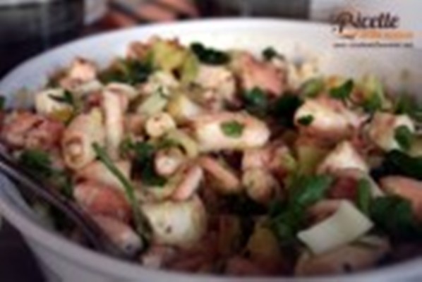 Scola il polpo e le patate, elimina l’eccesso di pelle dal polpo, stacca la sacca dai tentacoli e riduci tutto a pezzi.