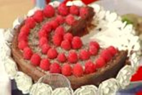 Al termine della cottura sfornare il dolce e farlo intiepidire (la superficie tenderà a sgonfiarsi e si formeranno parecchie crepe). Versare al centro della torta il resto del composto di cioccolato e metterla in frigorifero a rassodare per almeno mezz'ora. Al termine, decorare a piacere con i lamponi e volendo anche con qualche ciuffetto di panna montata.