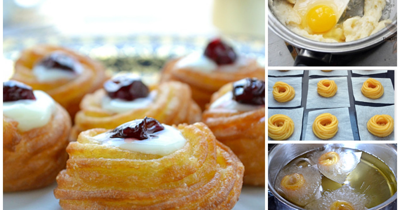 Preparare la pasta per le zeppole: sciogliere il burro con l'acqua, lo zucchero e il sale. Togliere dal fuoco e aggiungere la farina setacciata. Rimettere sul fuoco e mescolare per 5 minuti. Lasciar raffreddare poi aggiungere un uovo alla volta e mescolare bene fino a che non sia ben incorporato. Mettere in una sac a pochè con una bocchetta stellata e formare delle ciambelline su una teglia coperta da carta forno.