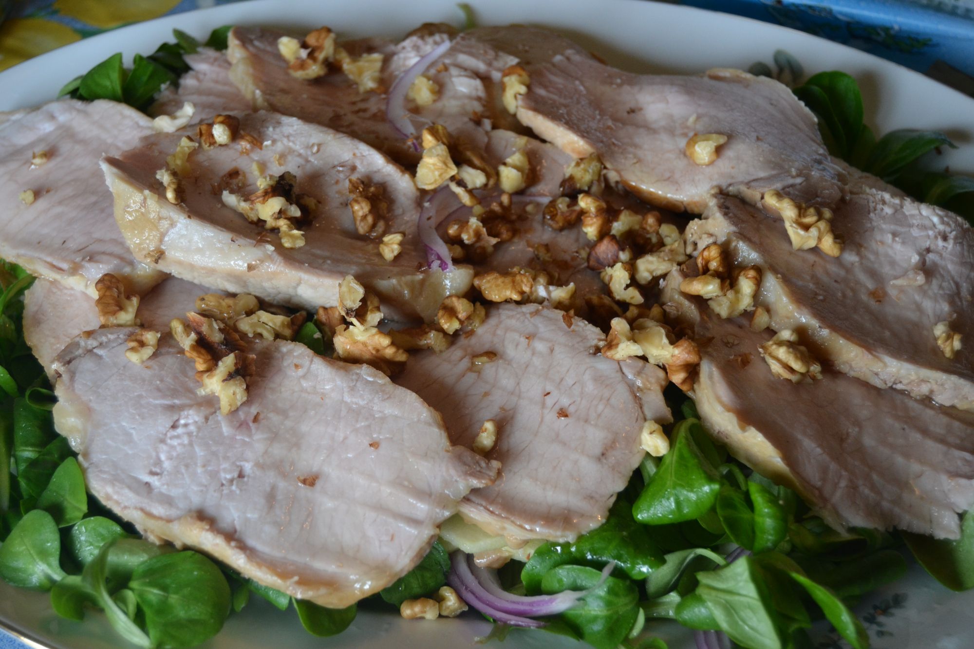 In un capiente piatto da portata disponete il songino, poi la lonza tagliata a fette, le mele e le noci. Irrorate con la salsa al miele e servite.