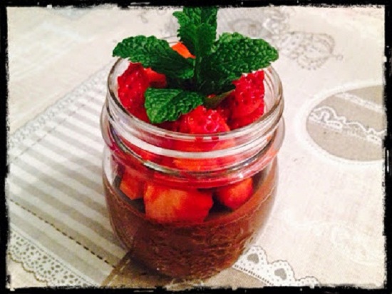 Versare la crema al cioccolato nei bicchieri o barattoli. Prima di servire, decorare la torta con le fragole precedentemente lavate, asciugate e tagliate e guarnire con un rametto di menta fresca.