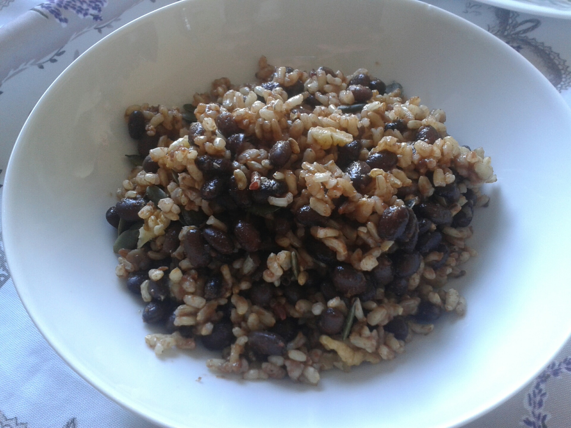 Nel frattempo, cuocete il riso in acqua bollente salata per circa 25 minuti. Scolatelo e unitelo nella casseruola con i fagioli. Ultimate aggiungendo i semi di zucca.