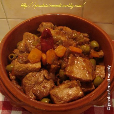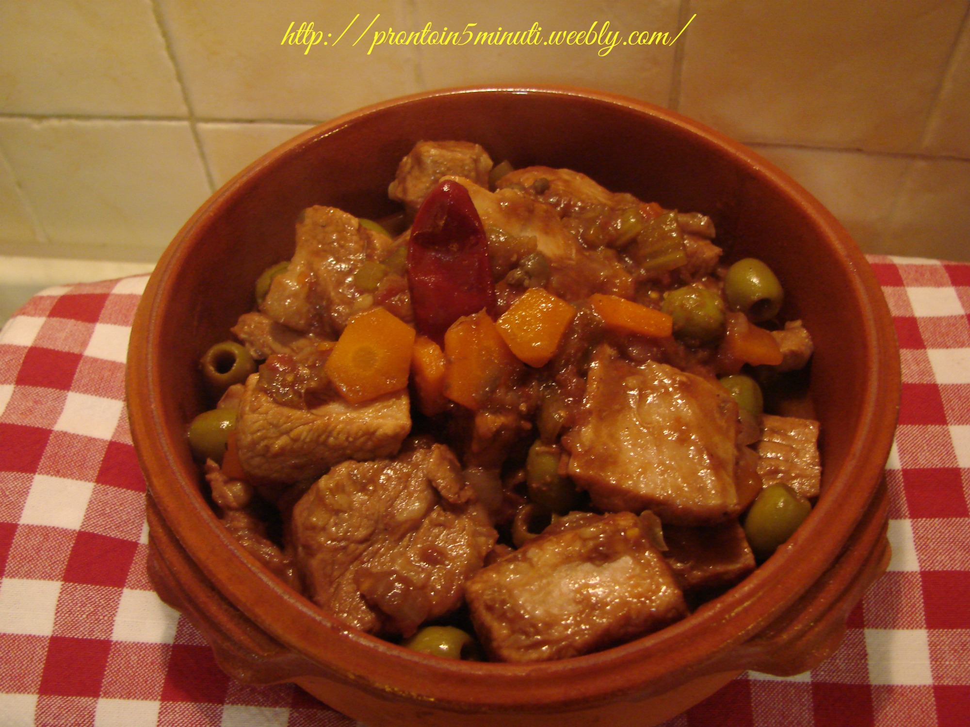 Sfumare con l'aceto balsamico, ricoprire la carne con dell'acqua e lasciare cuocere per almeno un'ora con il coperchio socchiuso. Pochi minuti prima che la carne finisca di cuocere aggiungere le olive, regolare di sale e pepe.