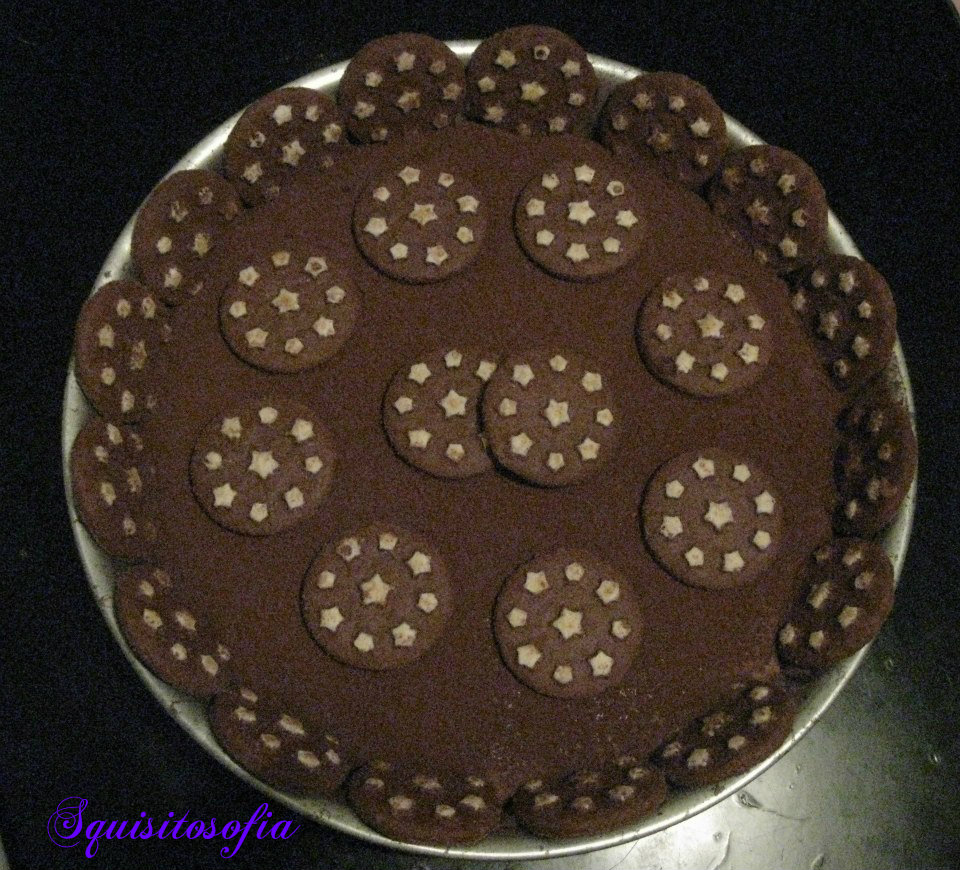 Versate la crema sulla base di biscotti al cacao, spolverizzate con del cacao amaro e guarnite a piacere con altri biscotti.