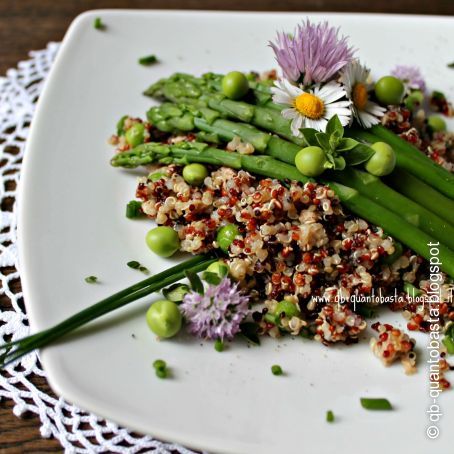 Comporre mettendo in ogni piatto una base di quinoa con tonno e piselli, sopra asparagi, un filo d'olio, pepe, i piselli tenuti da parte e le erbe tritate.