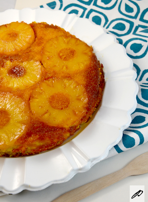 Preparate il caramello facendo sciogliere in un pentolino lo zucchero e poca acqua, attenti a non farlo bruciare, appena inizierà a colorirsi toglietelo dal fuoco e versatelo subito sul fondo della teglia. Aggiungete lo fette di ananas intere sopra allo strato di caramello, asciugatele bene dal succo altrimenti potrebbero schizzare con il calore.