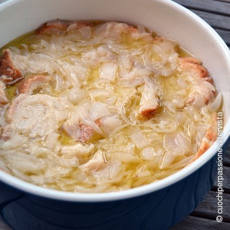 Ponete nella zuppiera le fette di pane tostate, a coprirne il fondo, versate la zuppa di cipolle e lasciate intiepidire.