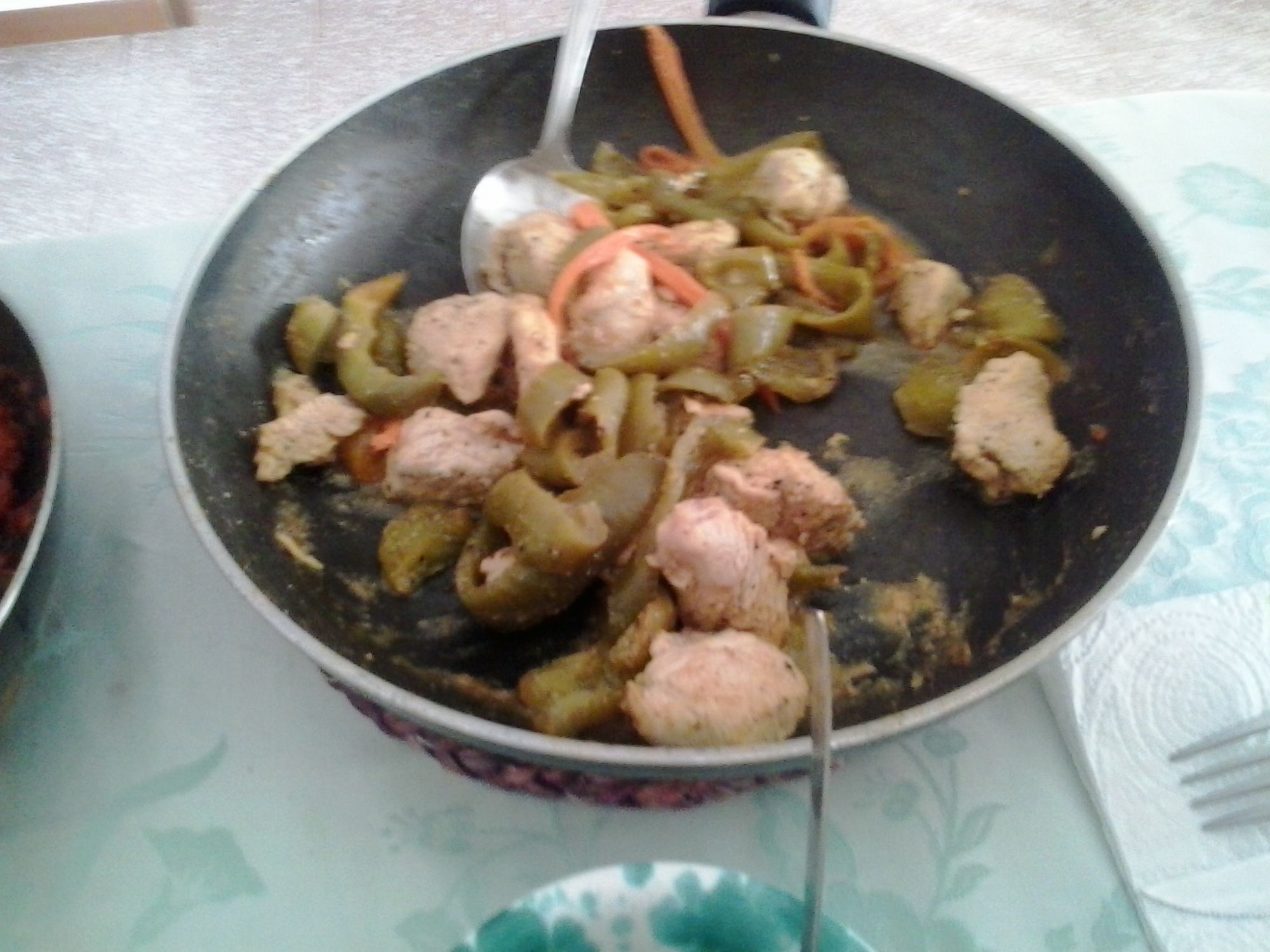 Trascorsa la mezz'ora o piu', riscaldate a fuoco alto una antiaderente, quando sarà ben calda versate le verdure con tutto il succo di marinatura, coprite e lasciate cuocere 5 minuti, quando le verdure saranno ammorbidite unite anche il pollo con tutta la marinatura, mescolate bene, regolate di sale e portate a cottura.