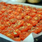 Spolverate ora i pomodorini con il sale, lo zucchero, il pepe, l’aglio, l’origano ed il timo; completate con un giro d’olio extravergine d’oliva.