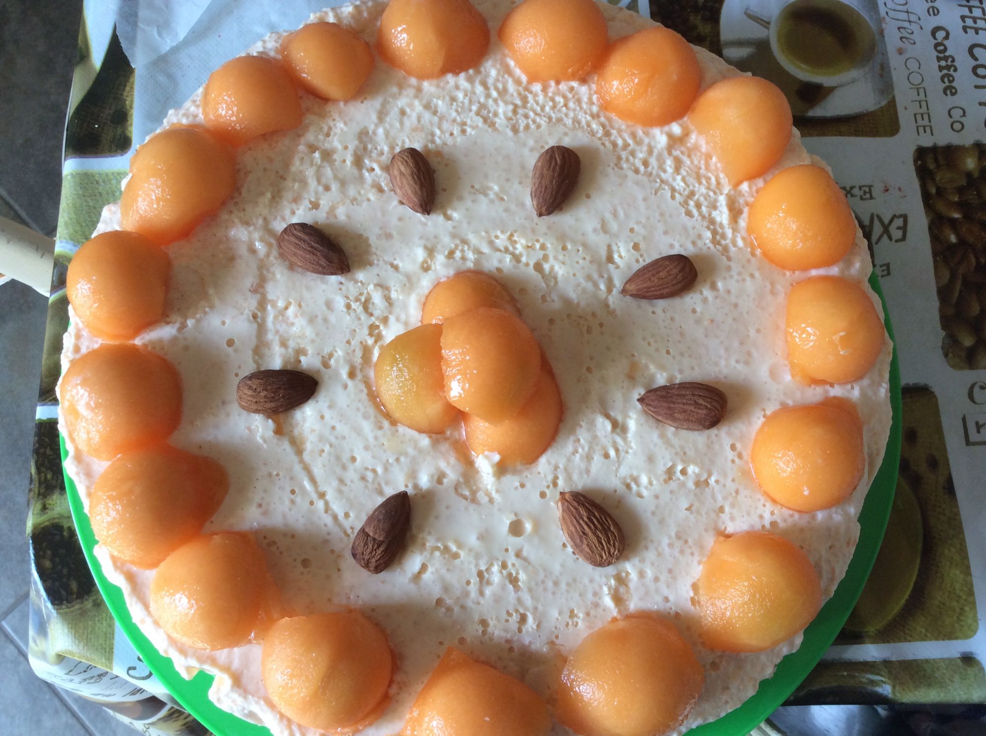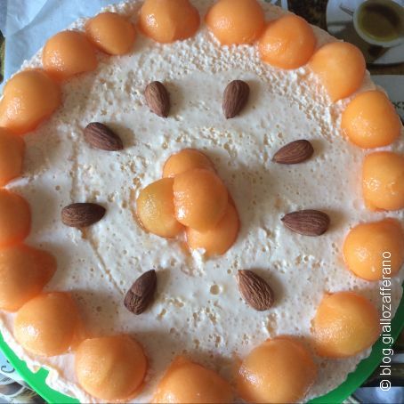 Una- due ore prima di servire, decorate la torta come più vi piace, io ho tagliato a metà un altro melone, ne ho tolto i semi ,l'ho fatto scolare per togliere tutta l'acqua che era rimasta all'interno e con uno scavino ho ricavato delle palline di melone che ho utilizzato per decorare. Poi ho aggiunto delle mandorle per richiamare la base della torta e 2 foglioline di basilico, perché non avevo la menta, per dare colore.