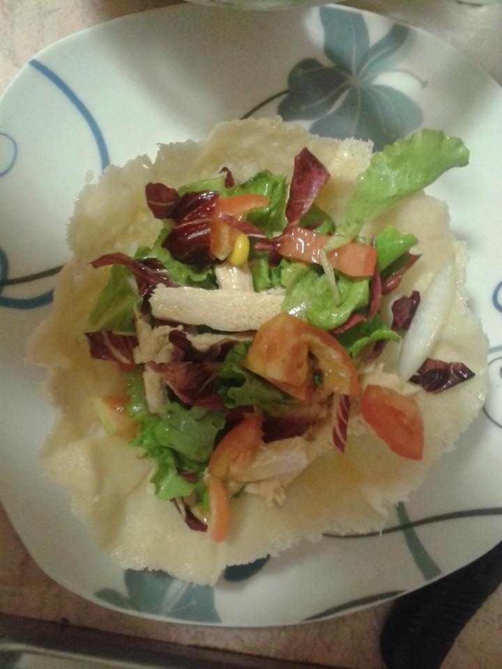 Quando il cestino di formaggio sarà pronto, toglierlo dal frigorifero. Aggiungere al suo interno l'insalata preparata nell'insalatiera. Condirla con sale e un filo di olio.