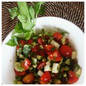 Tagliate in quattro parti i pomodorini e riducete a dadolata il resto delle verdure (avocado compreso). Mettete tutte le verdure in una ciotola con sale, pepe, basilico (ridotto in striscioline a coltello) e succo di limone. Ora lasciate insaporire la dadolata mescolando di tanto in tanto, per il tempo necessario alla cottura di riso e soia.