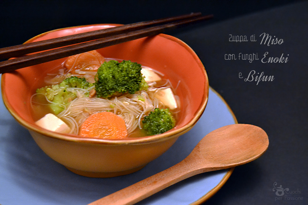 Eccomi tornata a voi dopo la (breve) vacanza nel Salento, ho pensato di riaprire le danze in cucina con una ricetta asiatica, leggera e ricca di ingredienti salutari, la zuppa di miso con funghi Enoki e Bifun (spaghettini di riso).