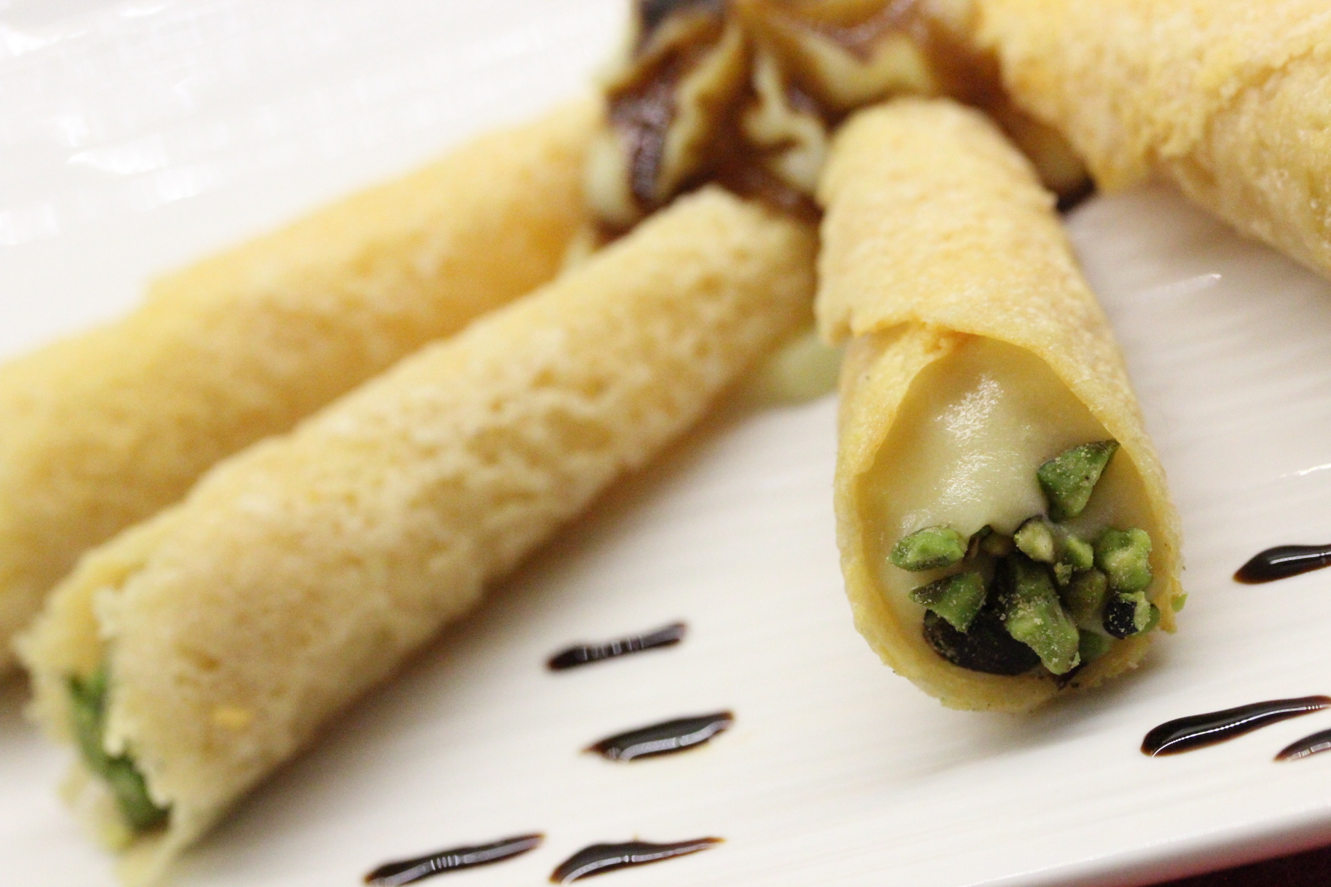 Mettere la crema in sac à poche, riempire le cornucopie e rifinirle con granella di pistacchio grossolana, leggermente tostata, formare un ciuffo di crema con beccuccio a stella e qualche goccia di balsamico, impiattare le cornucopie, decorare il piatto e ... goderselo!!