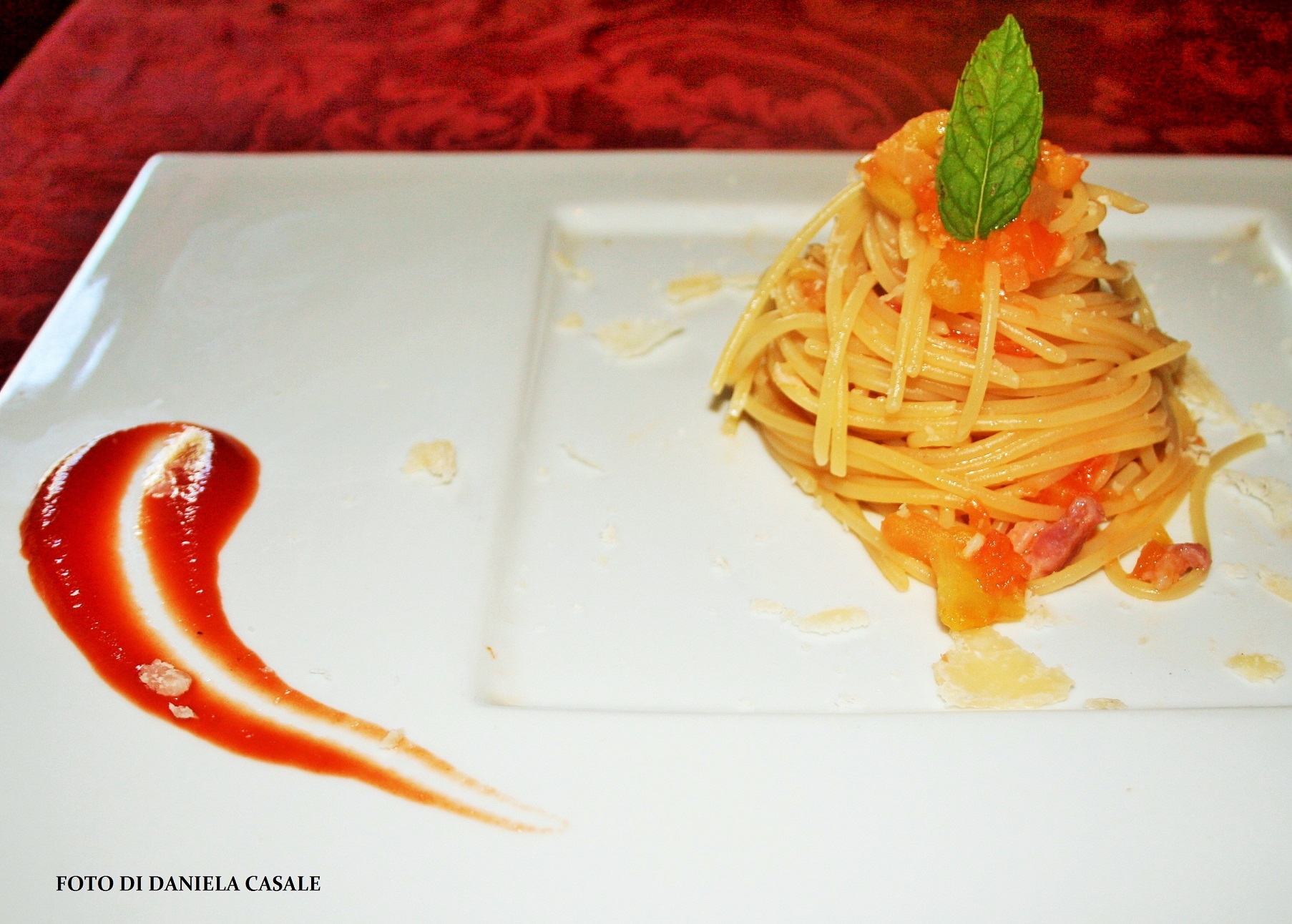 Spaghetto con filetti di pomodoro verde, bacon e ricotta salata