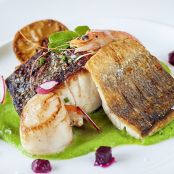 Doppio filetto di branzino agli agrumi e pepe, farcito ai calamari e gamberetti con pancetta croccante e porri al prosecco
