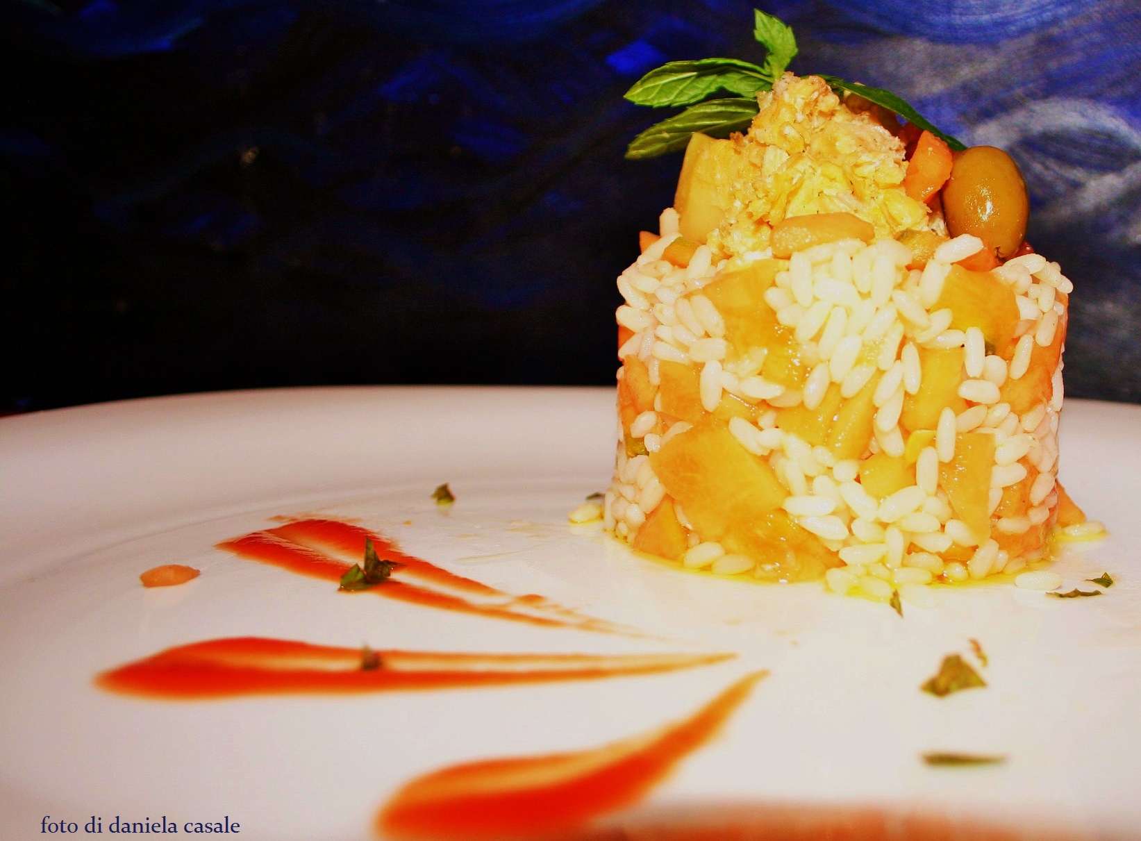 a questo èunto, in un cotenitore capiente, verstae il riso ormai freddo, il trito di acciughe. Il melone ( lasciatevene 4 cucchiaini per la decorazione), i dadolini di cappesante ( anche qui lasciatene un pochino per la decorazione), le uova( stesso discorso), mescolate bene, condite con olio, sale e un giro di pepe.