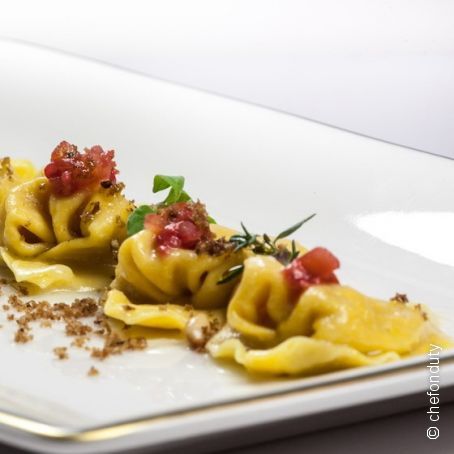 Cuocete i ravioli e scolateli, serviteli in una fondina ricoperti con la trota e bagnati con il fumetto di pesce e sedano. Adagiatevi a decorazione i pomodori confit.