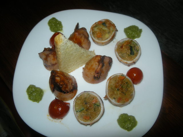 Per una bella presentazione..consiglio di tagliare i calamari in due e sistemarli in bell'ordine sul piatto, con al centro un crostino di pane bruschettato.