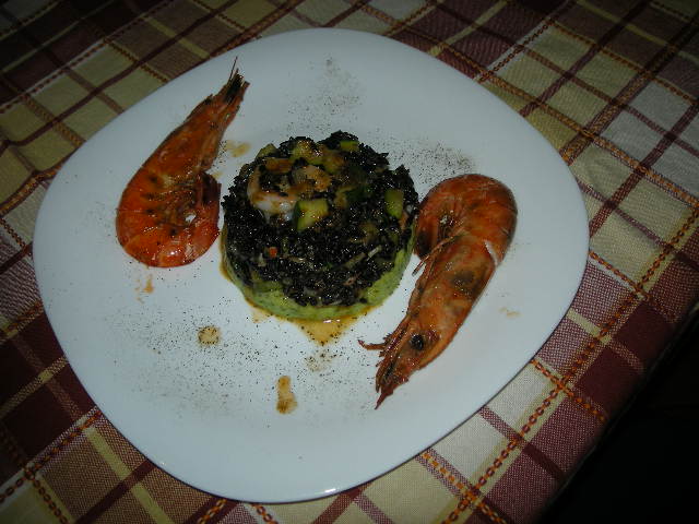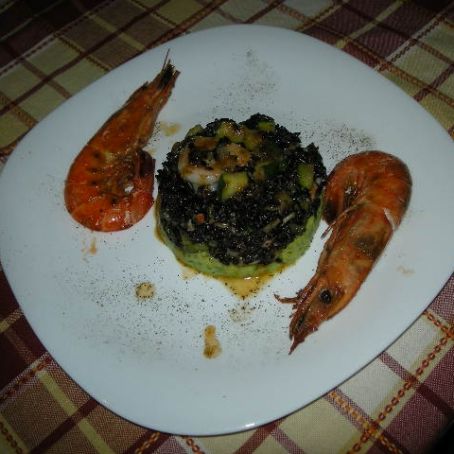 Siamo pronti a comporre il nostro piatto: posizionate il coppapasta al centro del piatto e alla base mettete la cremina di zucchine, dopo il riso condito..mettete in cima due gamberi...e di lato adagiate i 2 gamberi interi che avete rosolato leggermente in padella con un filo d'olio.