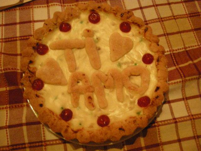 Adesso standete la frolla su carta da forno, trasferitela su lo stampo da crostata,finite con il ripieno e decorate con ciliegine candite.