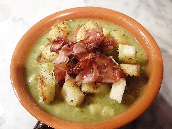 A cottura ultimata,spegnete il fuoco e far riposare la zuppetta..intanto bruschettate il pane che avete tagliato a cubetti (crostini) e lo speck tagliato a striscioline (dev'essere croccante).