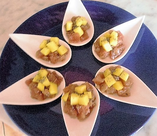Impiattate la tartare con sopra i cubetti di mango e semi di papavero.