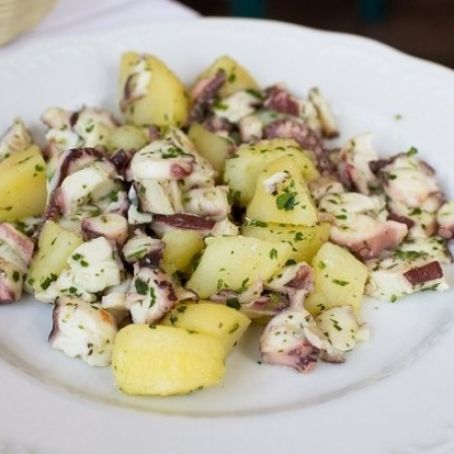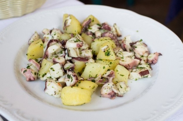 Mettete in una ciotola il polpo, le patate, le olive e condite con olio, il prezzemolo sale fino e pepe nero macinato al momento.
