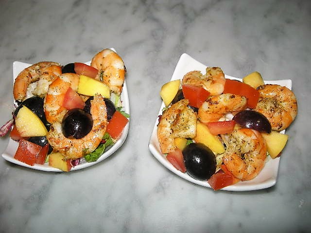 Componete il piatto con l'insalatina mista alla base,dopodichè aggiungete l'uva taglaita a mtà e privata dei semi, la pesca taglaita a cubetti piccoli, i gamberi rosolati e infine i pomodorini.