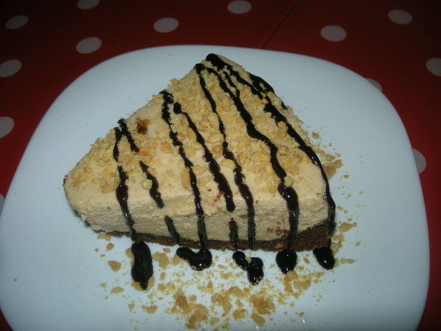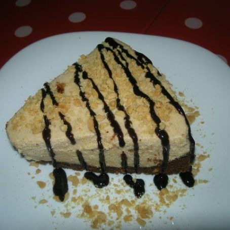 Servite la cheesecake con un topping al cioccolato e arachidi salati tritati.