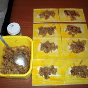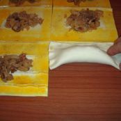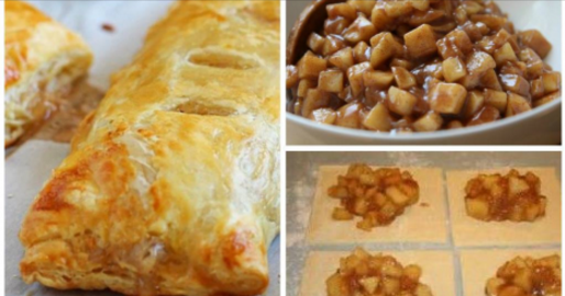 Tagliate la pasta sfoglia in quadrati e ungete con dell'uovo sbattuto il bordo. Disponetevi sopra ogni quadrato due cucchiaini di mele.