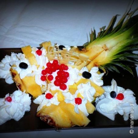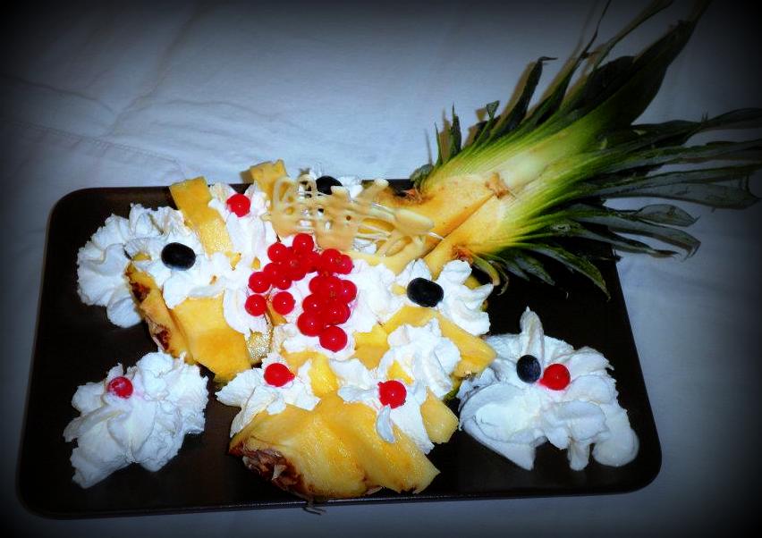 Separate quindi la polpa dalla buccia e tagliatela a spicchi, disponendoli poi a zig-zag fra loro. Montate la panna fresca con lo zucchero a velo e la vaniglia. Negli spazi dell'ananas rimasti liberi, aiutandovi con una tasca da pasticcere, fate dei ciuffetti di panna. Sopra adagiate con cura la frutta mista. A piacere potete decorare infine con del cioccolato bianco fuso.