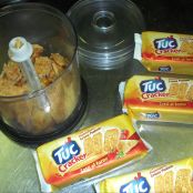 Prendete le fette di pollo e tagliatele a piccoli pezzetti. Sbriciolate i Tuc con il mixer, poi aggiungeteci il rosmarino tritato fine. Mescolate il tutto e mettetelo in una insalatiera.