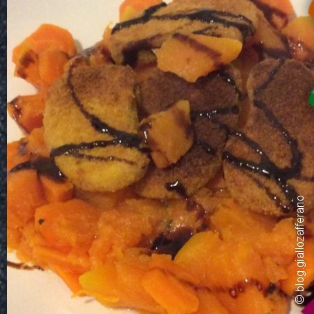 Sistemare la zucca su un piatto formando un "letto" e disporvi al centro le pepite di merluzzo. Prima di servire, cospargere con la glassa di aceto balsamico.