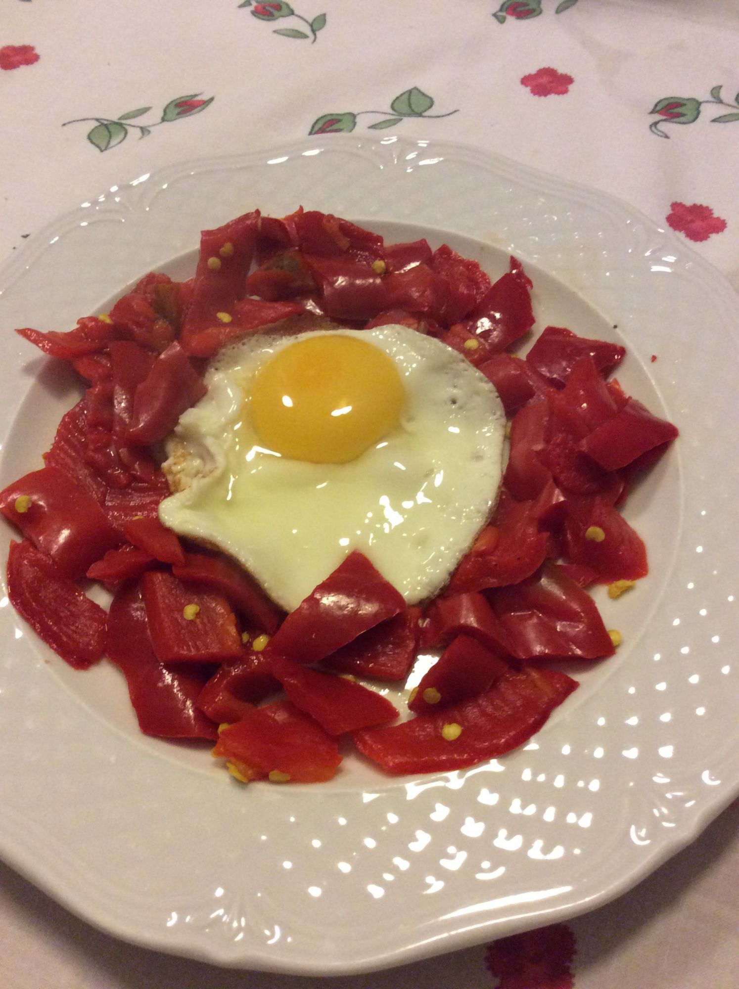 Quando mancheranno pochi minuti al termine della cottura dei peperoni, ungere una padella con un filo d’olio e cuocervi un’uovo all’occhio di bue.