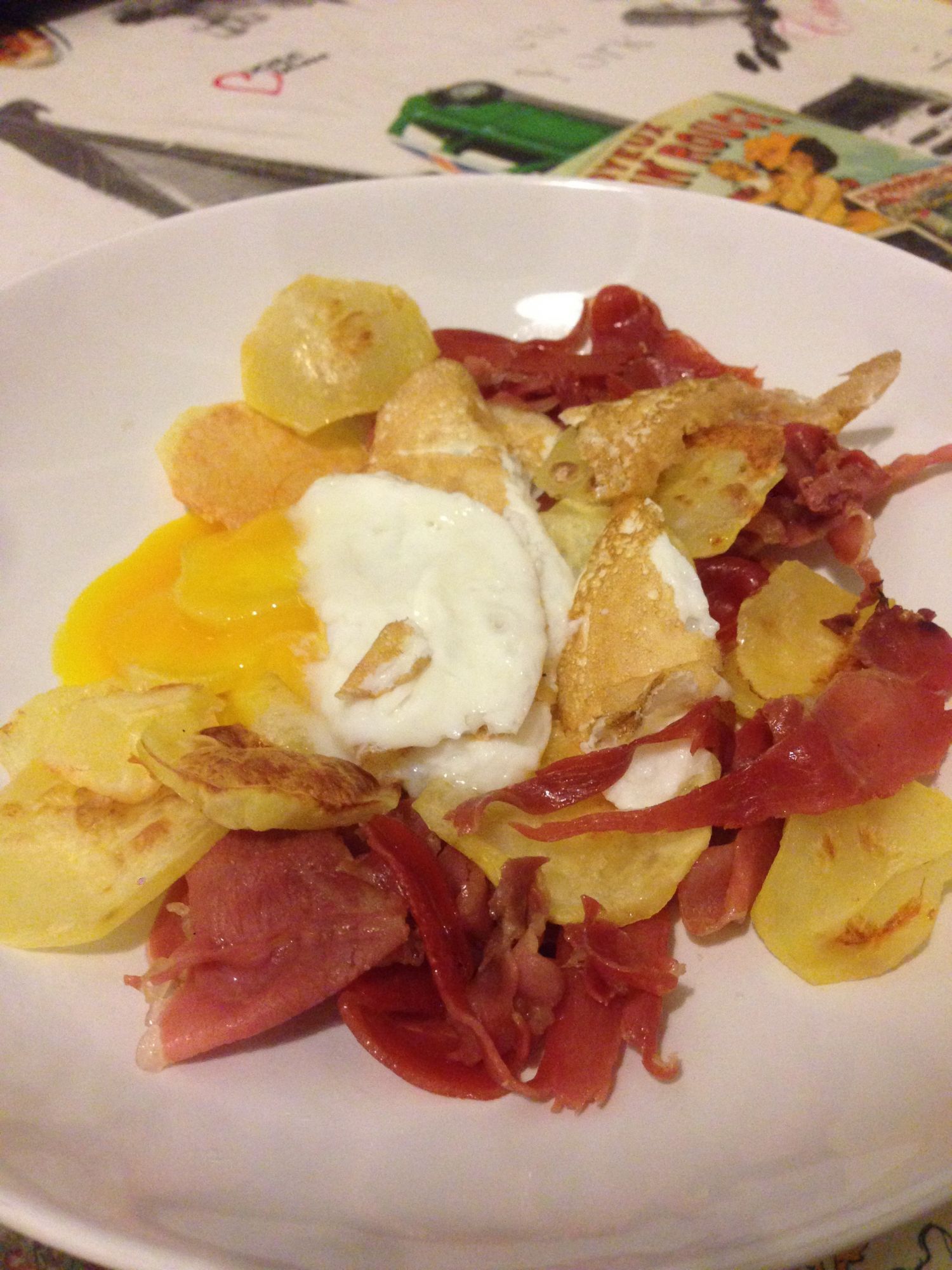 Sistemare le patate e il prosciutto in un piatto e sopra adagiarvi l’uovo fritto.
